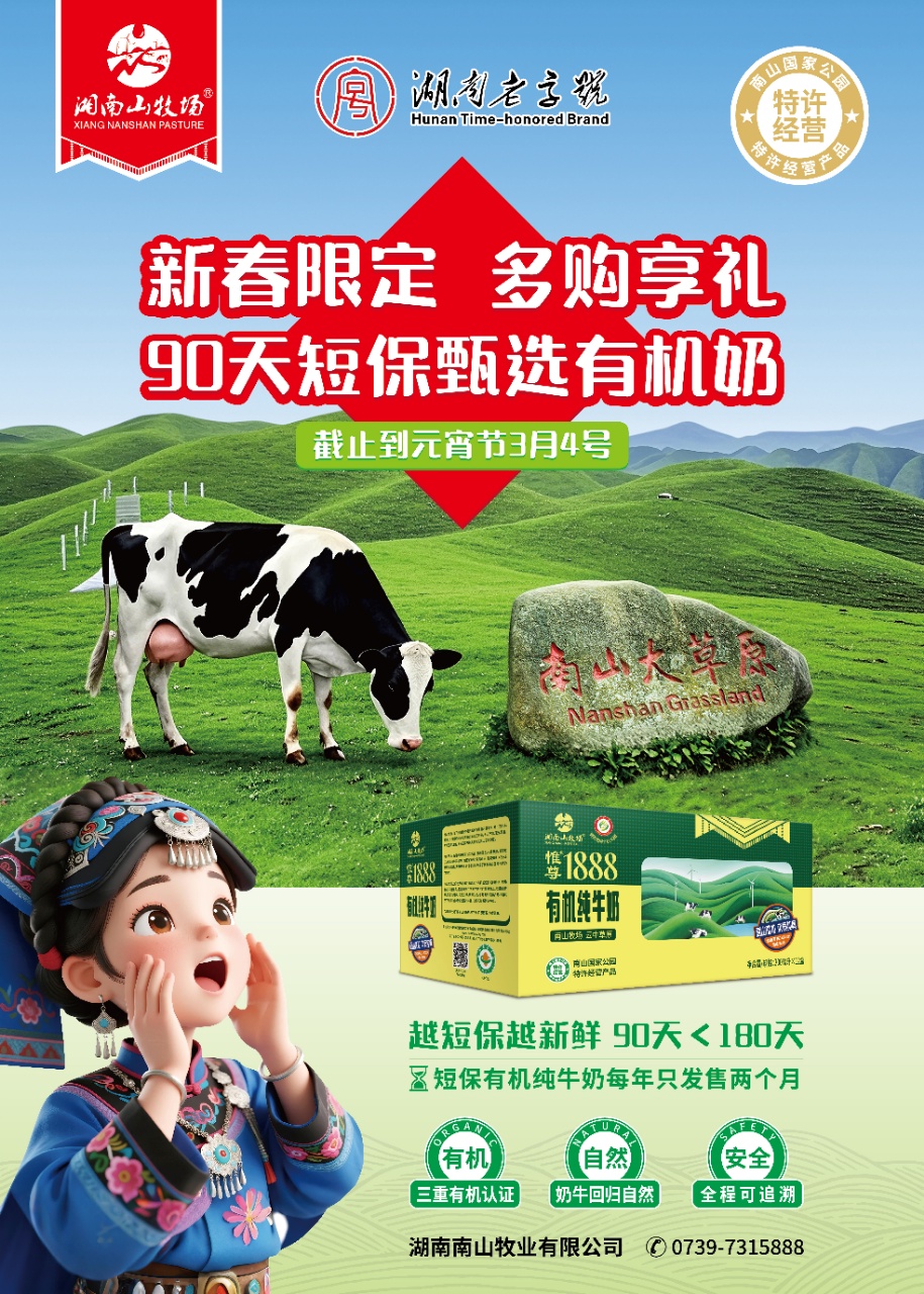 南山牧业懂你对品质的追求,特推出新春限定90天有机纯牛奶。拒绝漫长等待,只给你最新鲜的90天有机营养。这份专属美味每年仅发售两个月,正是尝鲜好时候!春节备货正当时,所有门店均有优惠,多购多享,活动截止到元宵节3月4日,让有机生活伴随整个新年!